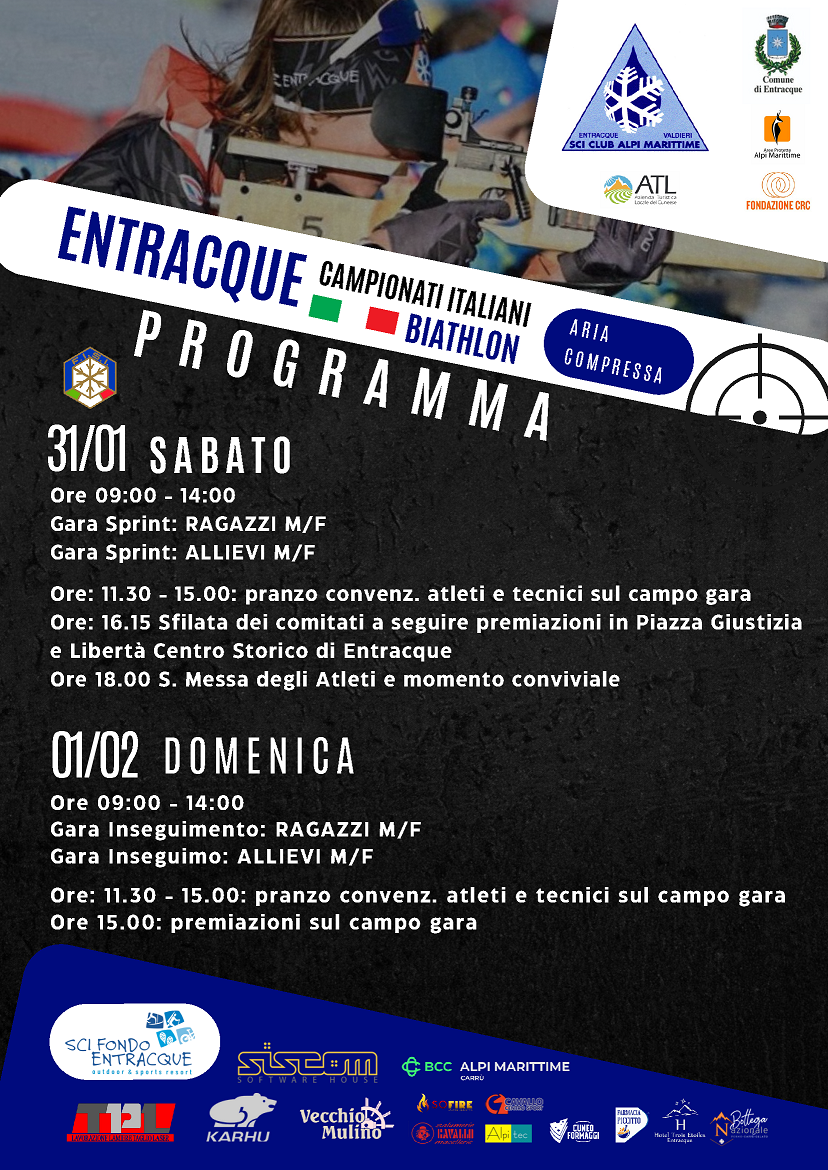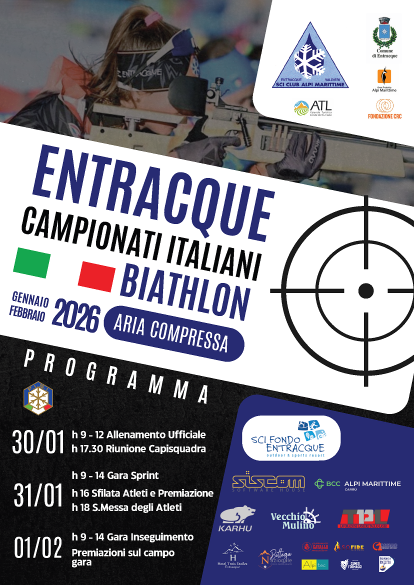 Entracque si prepara a diventare la capitale del biathlon giovanile ospitando i prossimi Campionati Italiani di aria compressa, in programma dal 30 gennaio al 1° febbraio dove oltre 260 atleti si sfideranno per aggiudicarsi i titoli italiani sprint e inseguimento. Ingresso libero.