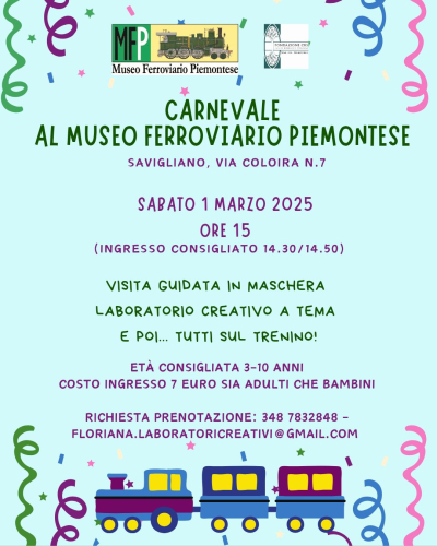 Domenica 8 febbraio, alle ore 10.00, presso il Museo Ferroviario Piemontese di Savigliano torna la festa di Carnevale. E' prevista un'intera mattinata dedicata ai più piccoli con visita guidata in maschera, laboratorio creativo e per concludere, giro sul trenino. Il costo è di 7 euro a persona e la prenotazione è obbligatoria.
