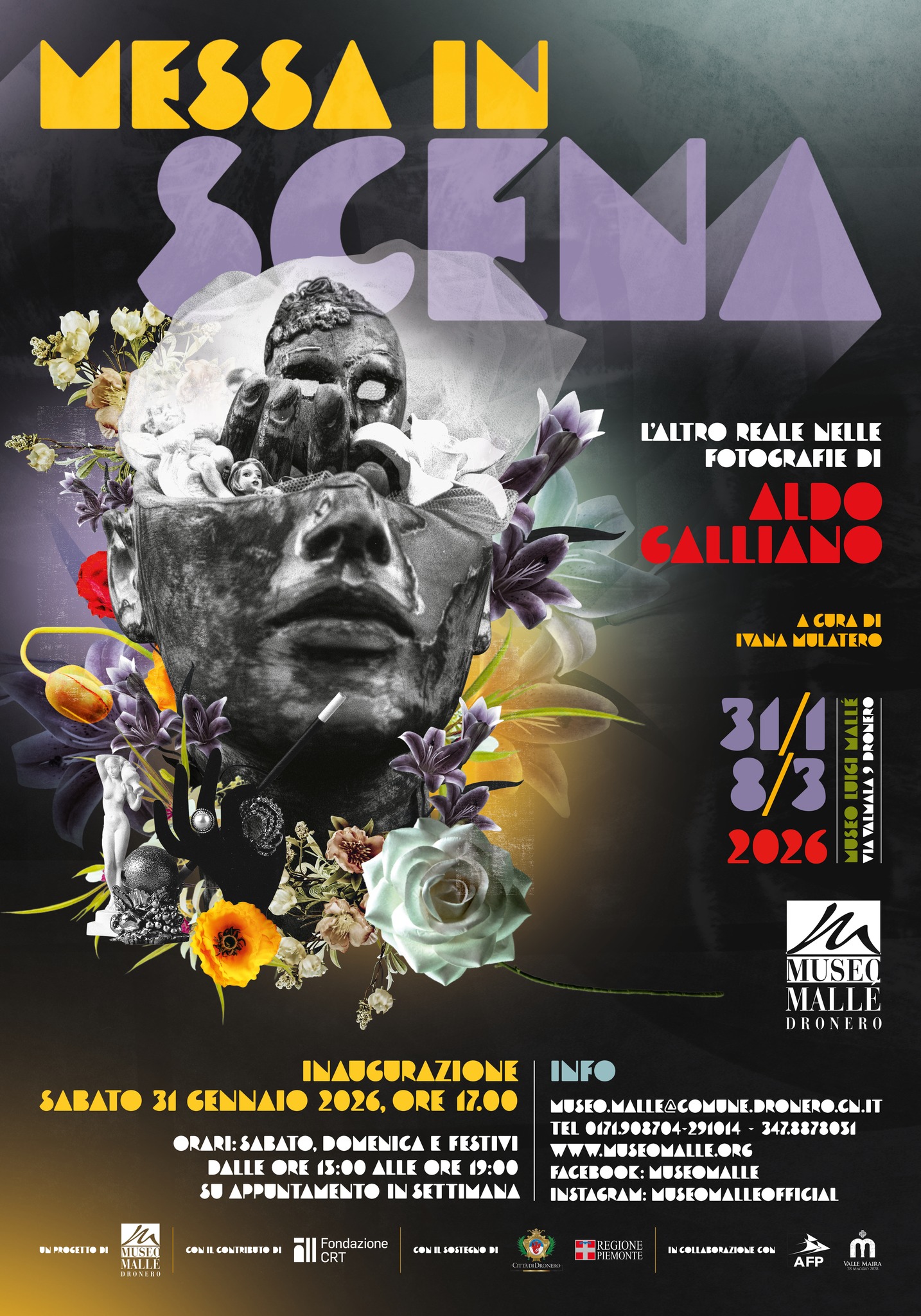Da sabato 31 gennaio a domenica 8 marzo, presso il Museo Mallè di Dronero si terrà la mostra "Messa in Scena - L'altro reale nelle fotografie di Aldo Galliano". La mostra verrà inaugurata sabato 31 gennaio alle ore 17.00 e sarà visitabile tutti i sabati, domeniche e festivi dalle ore 15.00 alle ore 19.00, visite su appuntamento durante la settimana.