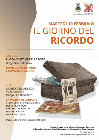 In occasione del Giorno del Ricordo il Comune di Borgo San Dalmazzo promuove due appuntamenti dedicati alla commemorazione e all’approfondimento storico. Al mattino si terrà un momento istituzionale mentre, alle ore 18, presso il Museo dell’Abbazia , è in programma l’incontro pubblico “La valigia di cartone. Storia di una famiglia zaratina per comprendere il Giorno del Ricordo: memoria, esodo e radici ritrovate”.