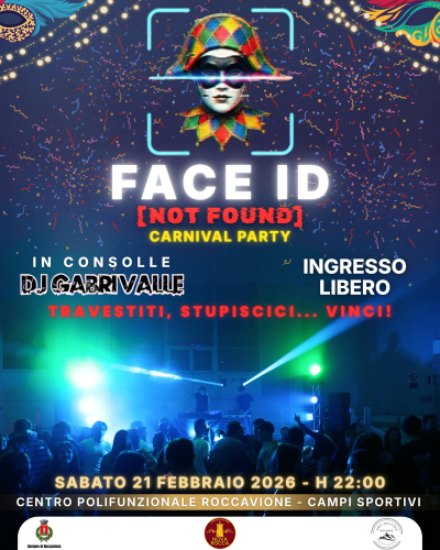 Sabato 21 febbraio, dalle ore 22, Roccavione festeggia il carnevale con LA festa mascherata FACE ID [NOT FOUND] – Carnival Party, presso il centro polifunzionale, in prossimità dei campi sportivi. Una serata tutta da vivere, tra maschere, musica e luci.