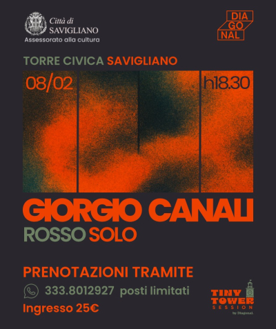 Domenica 8 febbraio, ore 18.30, presso la Torre Civica di Savigliano, l'Associazione Diagonal organizza "Rosso Solo" live acustico del musicista Giorgio Canali. Il costo d'ingresso è di 25 euro a persona e la prenotazione è obbligatoria.