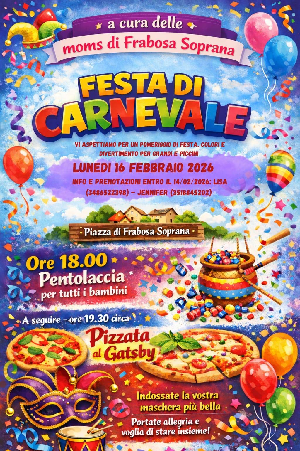 Lunedì 16 febbraio a Frabosa Soprana, vi aspetta un nuovo evento delle Moms: la festa di carnevale in piazza! Dalle 18.00 pentolaccia per tutti i bambini e le bambine, e dalle 19.30 circa pizzata al Gatsby. Prenotazioni entro il 14/02 ai numeri +39 348 652 2398 (Lisa) e +39 351 884 5202 (Jennifer).