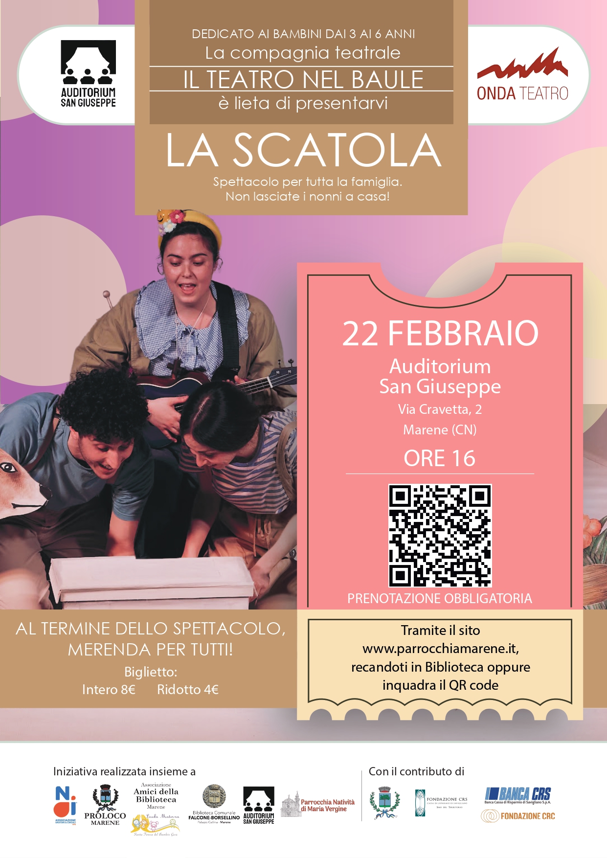 Presso l’Auditorium San Giuseppe di Marene, domenica 22 febbraio alle ore 16.00, si terrà lo spettacolo teatrale "La Scatola" con la compagnia Il Teatro nel Baule, rivolto ai bambini e alle loro famiglie. A seguire, merenda per tutti. Prenotazione obbligatoria qui, per informazioni e per eventuali cancellazioni della prenotazione rivolgersi ai contatti di seguito riportati.