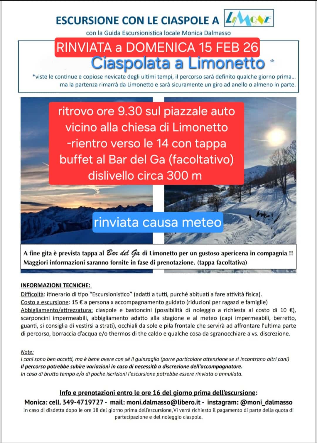 Domenica 15 febbraio ciaspolata sul far del tramonto con la guida escursionistica Monica Dalmasso. Ritrovo ore 14:00 sul parcheggio vicino alla chiesa di Limonetto. Costo € 15 a persona.