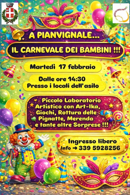 Martedì 17 febbraio dalle ore 14.30, festa di carnevale per bambini e bambine a Frabosa Sottana, nella frazione di Pianvignale. Giochi e divertimento per festeggiare insieme il Martedì Grasso: vi aspettano un piccolo laboratorio artistico con Art-Ika, pignatte, merenda tutti insieme a tante altre soprese. Per maggiori informazioni clicca qui. Ingresso libero.