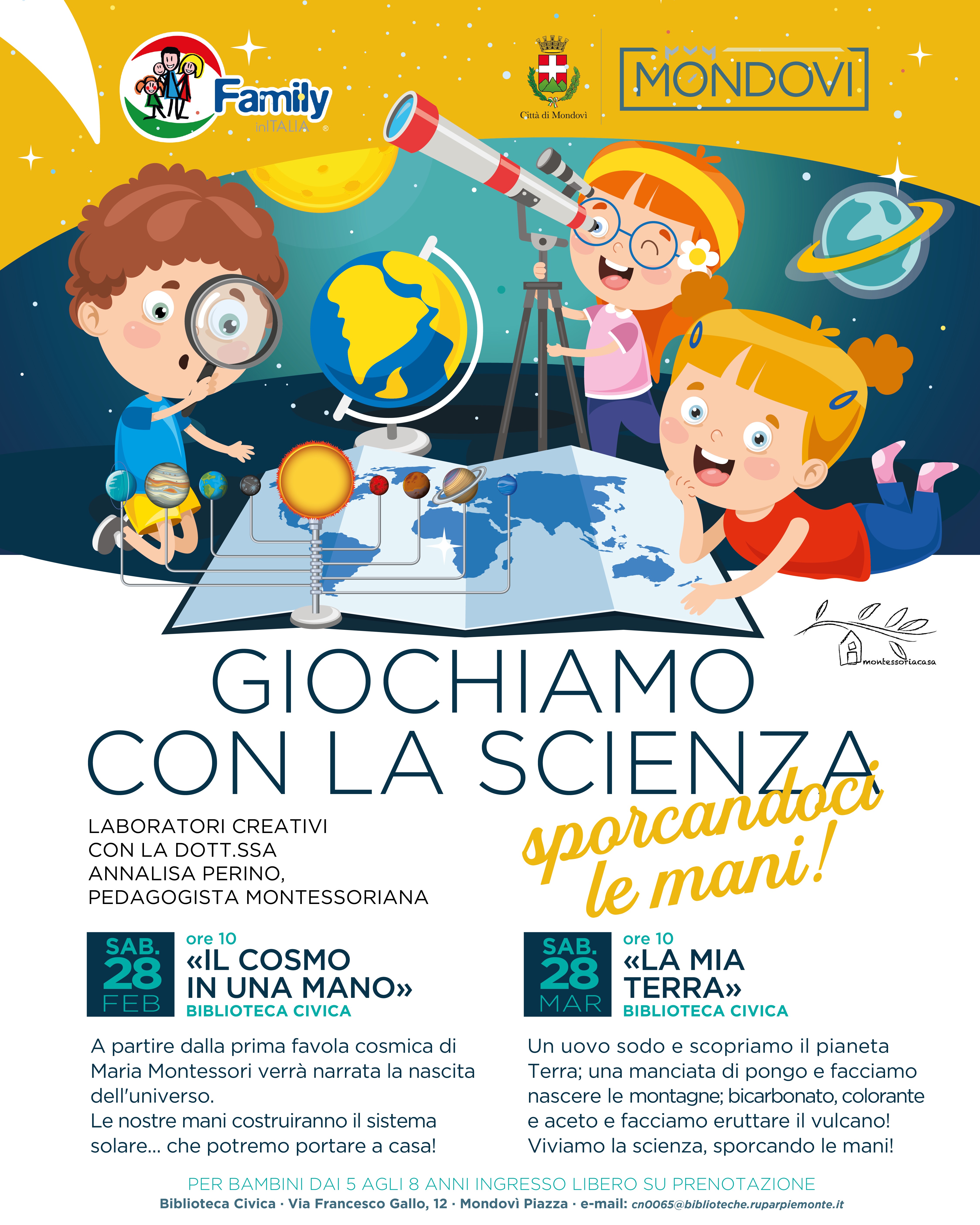 La biblioteca di Mondovì ospita due eventi dedicati a bambine e bambini dai 5 agli 8 anni dal titolo "Giochiamo con la scienza". Si tratta di laboratori creatici con la Dottoressa Annalisa Perno. Sabato 28 marzo alle ore 10 "La mia Terra": scoprire il pianeta terra con un uovo sodo, costruire montagne con il pongo e far eruttare un vulcano con il bicarbonato! Ingresso libero su prenotazione.