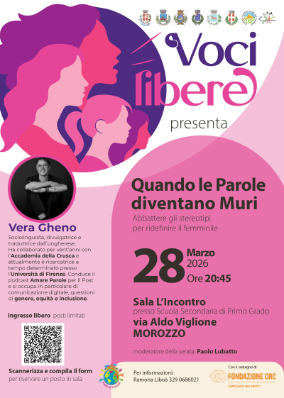 Non perderti l' appuntamento con Vera Gheno a Morozzo sabato 28 marzo alle ore 20.45 presso la Sala l'Incontro. Una serata dedicata all'abbattimento degli stereotipi per ridefinire il femminile attraverso la forza del linguaggio. Prenota il tuo posto