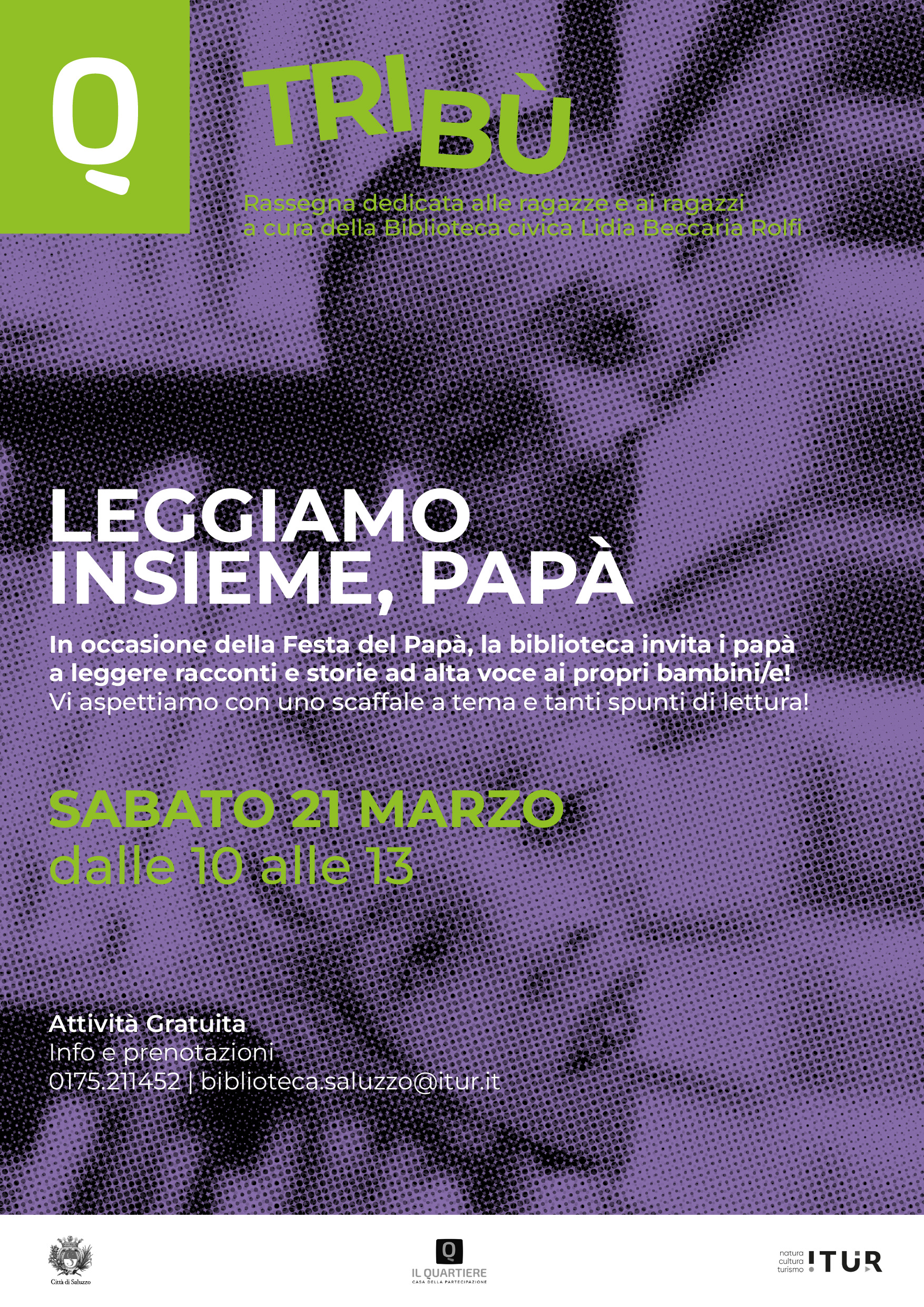 Sabato 21 marzo, alle ore 10.00, presso la Biblioteca Civica di Saluzzo, in occasione della Festa del Papà si terrà "Leggiamo insieme, papà", una mattinata in cui i papà saranno invitati a leggere racconti e storie ad alta voce ai propri bambini. Ingresso gratuito.