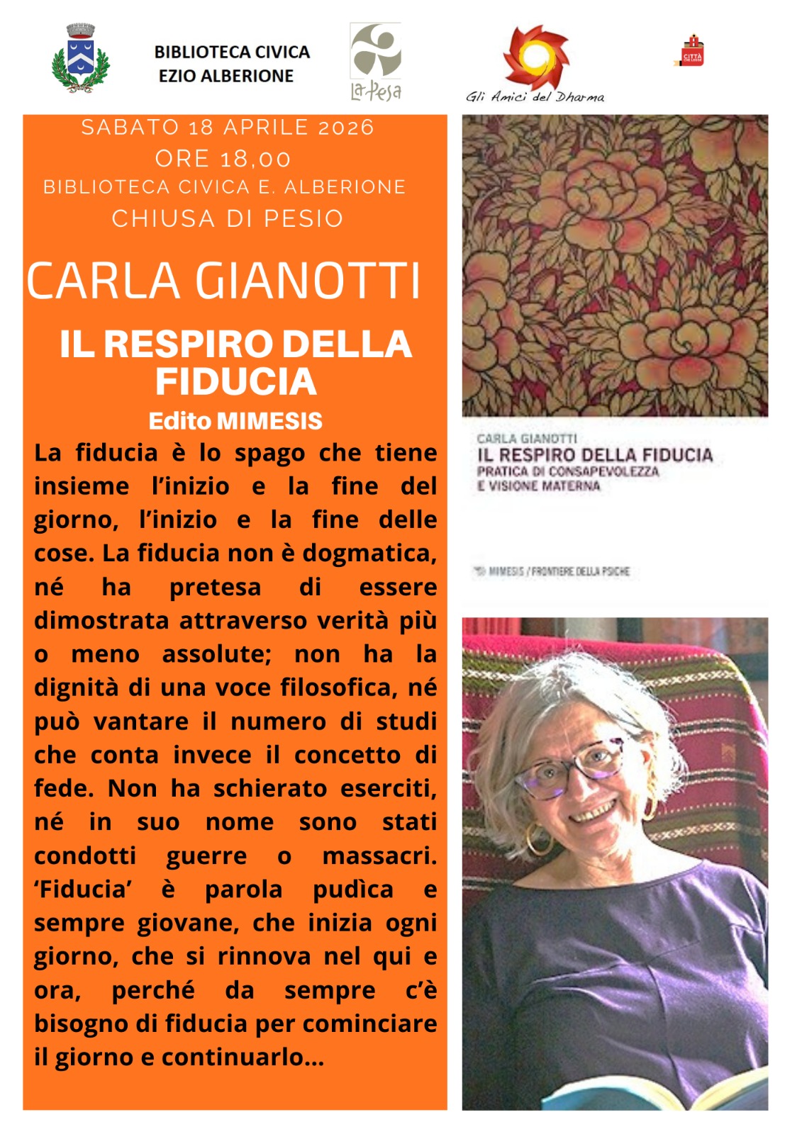 Sabato 18 aprile alle ore 18.00 presso la Biblioteca civica "E. Alberione" di Chiusa di Pesio incontro con Carla Gianotti che presenterà il suo libro "Il respiro della fiducia - Pratica di consapevolezza e visione materna".