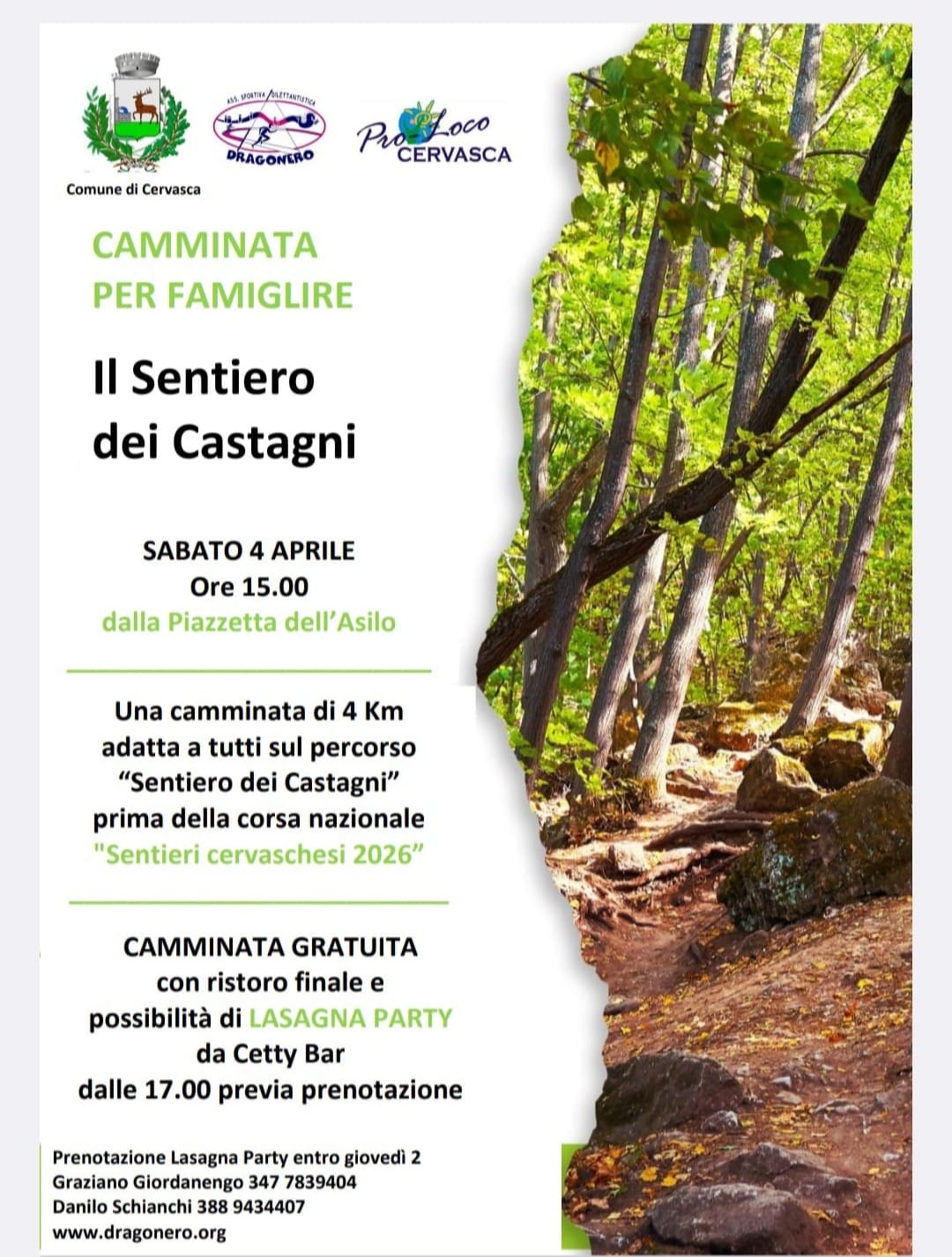 Sabato 4 aprile, alle ore 15,00 a Cervasca, l'Associazione Sportiva Dragonero organizza una camminata per famiglie lungo "Il sentiero dei castagni". Evento libero e gratuito.