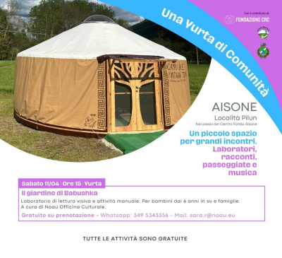 Sabato 11 aprile, alle ore 15,00 in località "Pilun" ad Aisone, in occasione della rassegna culturale "Una yurta di comunità" vi attende il laboratorio di lettura visiva e attività manuale "Il giardino di Babushka". Evento gratuito, prenotazione necessaria.