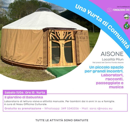 Sabato 11 aprile, alle ore 15,00 in località "Pilun" ad Aisone, in occasione della rassegna culturale "Una yurta di comunità" vi attende il laboratorio di lettura visiva e attività manuale "Il giardino di Babushka".