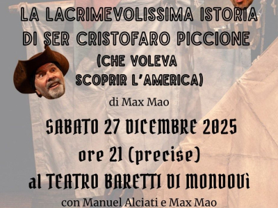 Sabato 27 dicembre alle ore 21 al Teatro Baretti di Mondovì la Compagnia Teatro Marenco di Ceva presenta lo spettacolo La lacrimevolissima istoria di Ser Cristofaro Piccione (che voleva scoprir l'America).