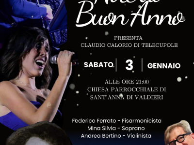 Sabato 3 gennaio, alle ore 21,00 presso la chiesa parrocchiale di Sant'Anna di Valdieri, Claudio Calorio di Telecupole presenta il concerto "Note di Buon Anno". Vi aspettiamo numerosi! Evento libero e gratuito.