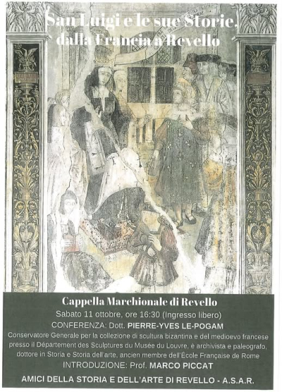 Sabato 11 ottobre, alle ore 16.30, la Cappella marchionale di Revello ospita il professor Pierre-Yves Le Pogam, dottore in storia e storia dell’arte medievale incentrata sulla figura del ‘Re Santo’, sul suo permanere nella mitologia francese nel passare dei secoli, e sugli affreschi di Revello. Ingresso libero.